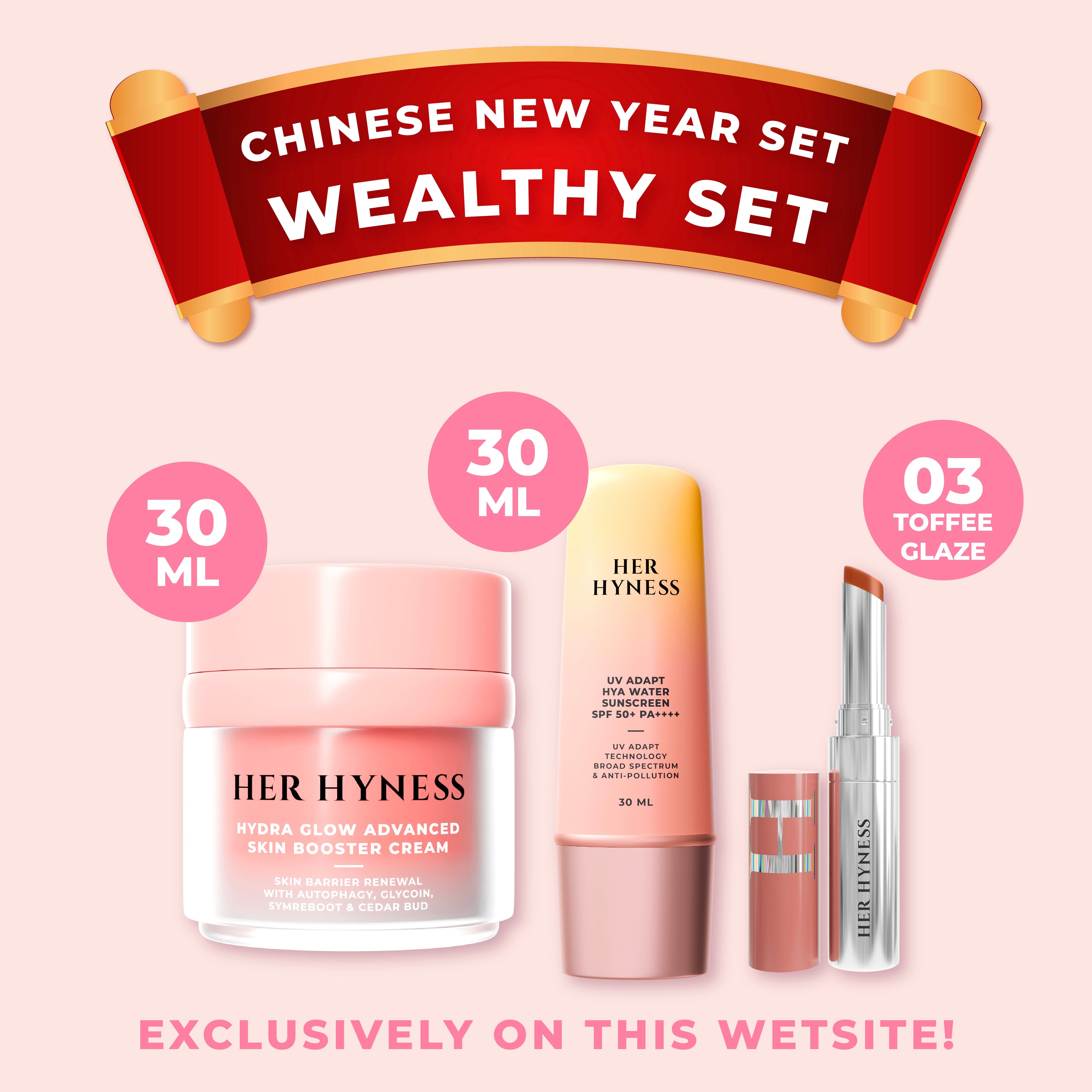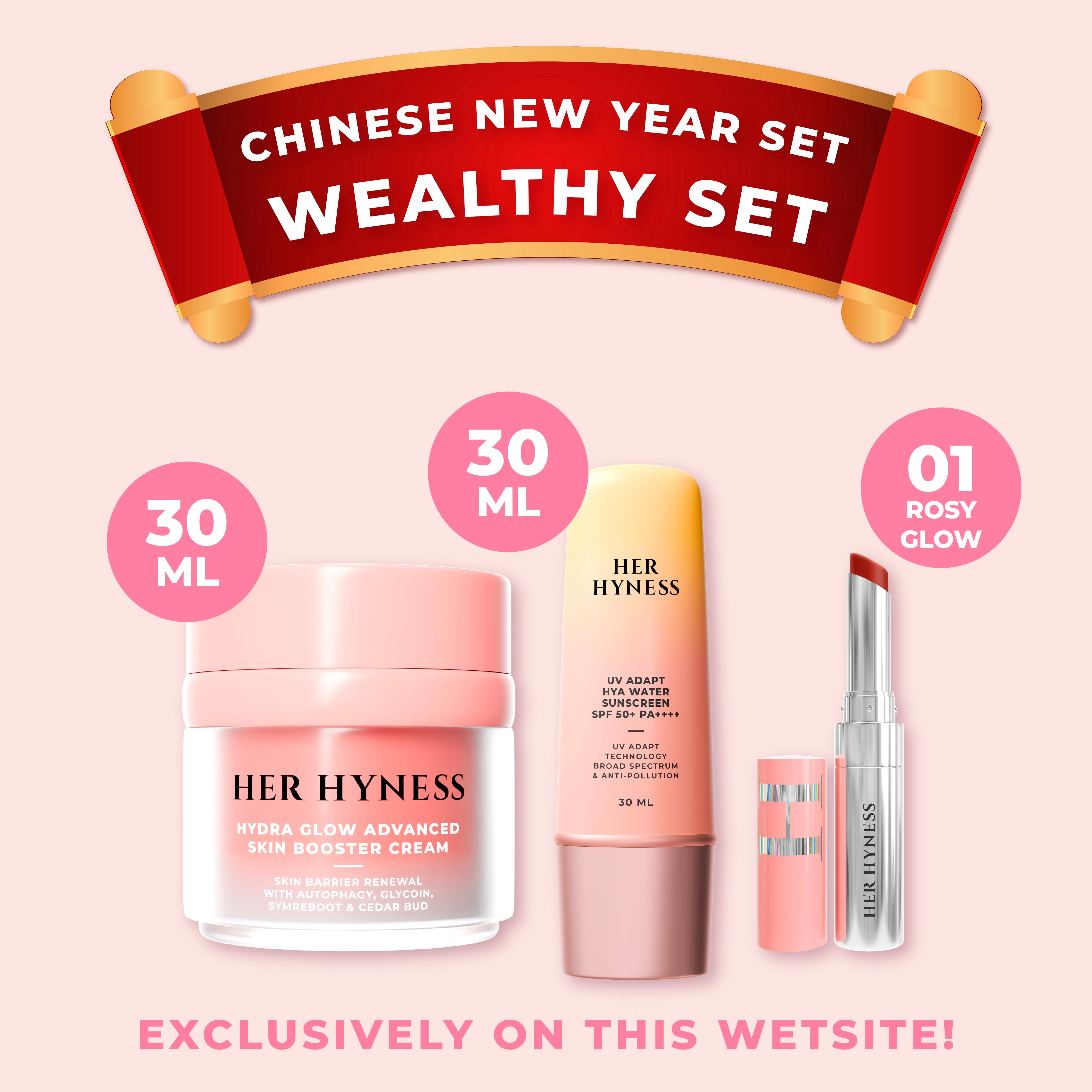 [16-28 Feb] CNY Wealthy Set - Hydra Glow Cream 30ml+Sunscreen 30ml+Lip Tint